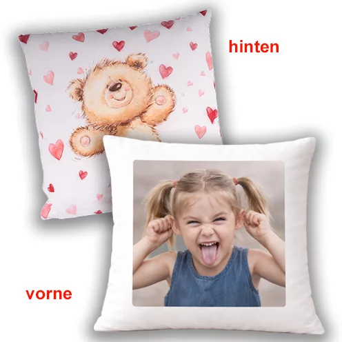 Dieses individuell bedruckbare Kissen ist besonders dekorativ. Ob als Sofakissen oder einfach als schönes Zierkissen: mit Foto und/oder Spruch versehen ist dieser Kissenbezug ein persönliches Geschenk für Groß und Klein. Der Kissenbezug mit den Bärlis eignet sich besonders als Kuschkissen für Kinder - Die Vorderseite kann natürlich mit eigenen Bildern und/oder Text bedruckt werden.